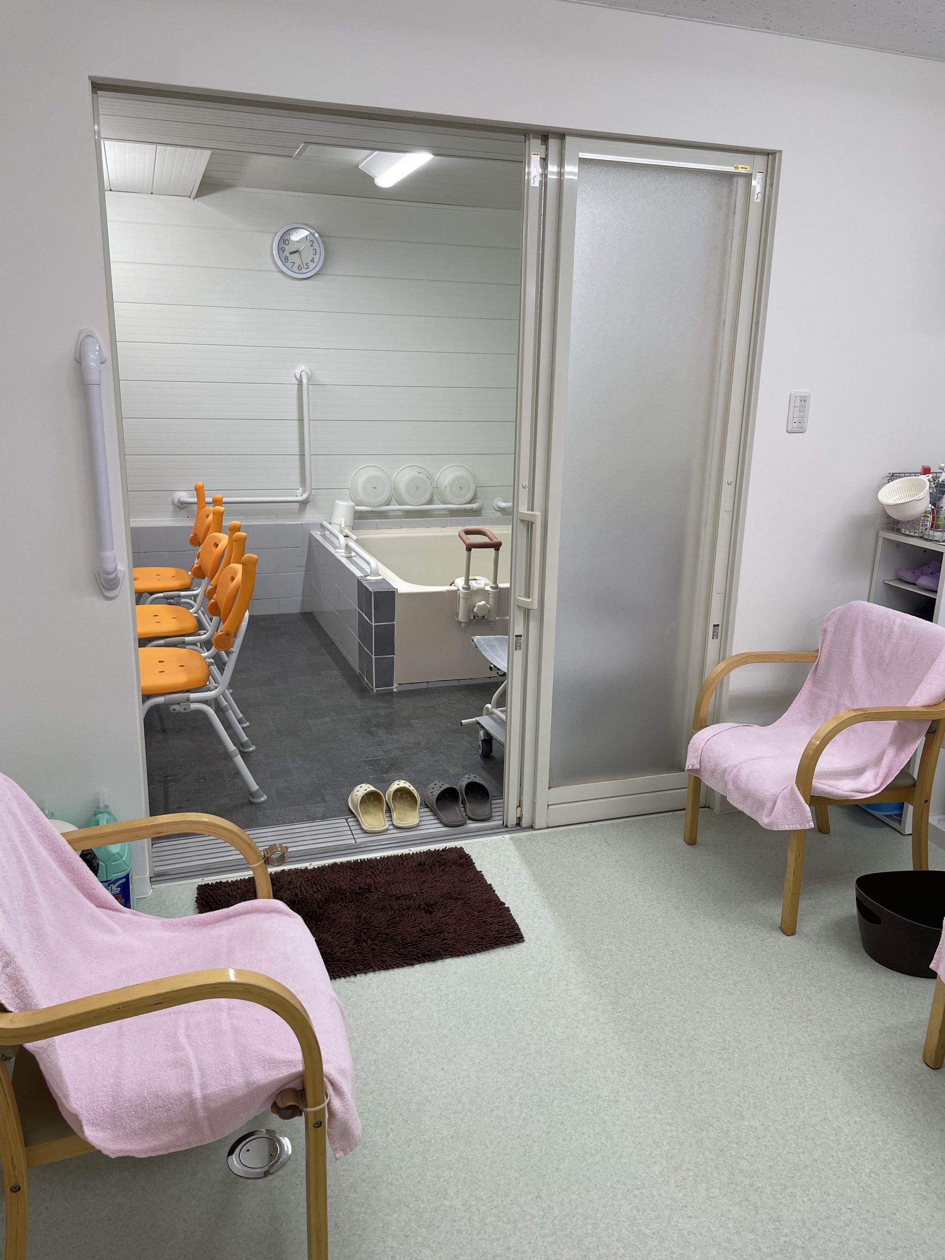 お風呂場へと続くスロープ、脱衣所、浴室の床は、滑りにくい材質へと変更し、より安全にご入浴を楽しめる環境を整備致しました。