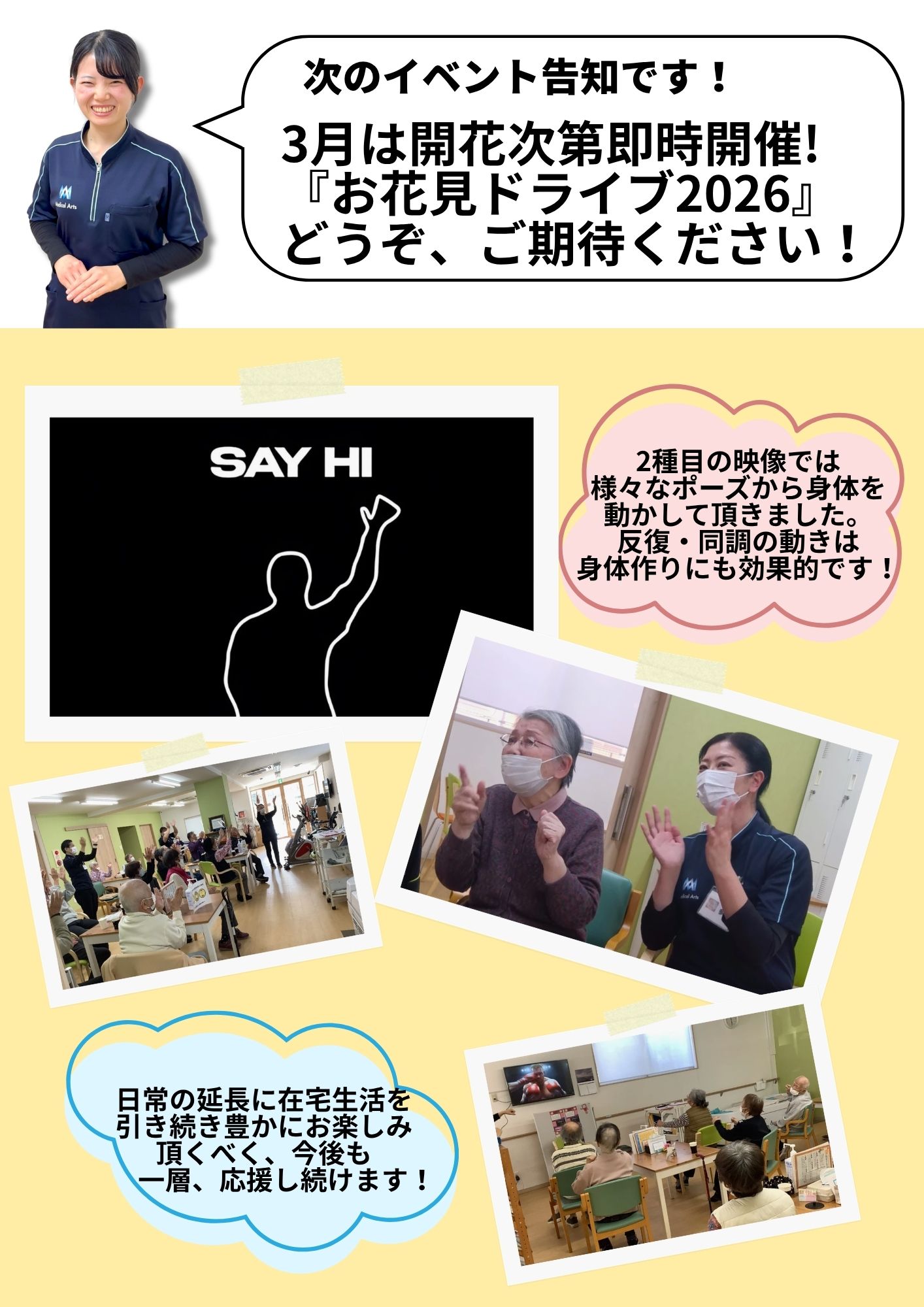 来月4月のイベントは、桜の開花に合わせて「お花見ドライブ2026」を即時開催いたします。どうぞご期待ください。